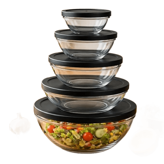 Conjunto de 5 Bowls de Vidro com Tampa Preta, Recipientes Herméticos para Alimentos, 140ml a 930ml, Transparente