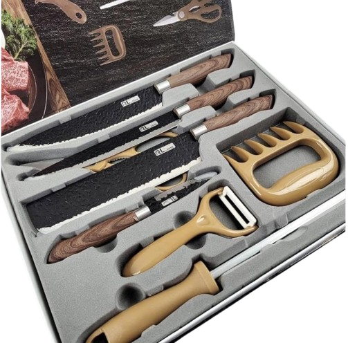 Kit Churrasco Premium 8 Peças – Conjunto Profissional de Facas Gourmet em Aço Inoxidável com Lâminas Antiaderentes e Corte Navalha – Amadeirado